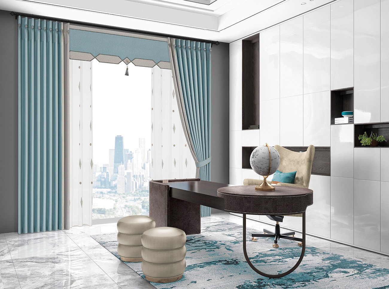 現(xiàn)代簡(jiǎn)約的素凈表象,潛藏著厚重內(nèi)里。布藝的肌理感賦予灰藍(lán)色高級(jí)質(zhì)感,不沾染一絲塵埃的干凈模樣讓空間觀感舒朗起來;簡(jiǎn)潔的平幔簾頭,配合簡(jiǎn)練的幾何圖案,恰到好處的垂墜感,打造恬然而優(yōu)雅的家居風(fēng)情。
