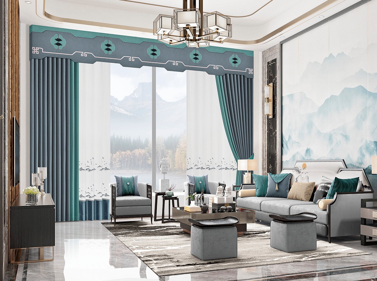 將傳統(tǒng)盤扣元素和回字紋用于窗簾,錯(cuò)落有致排列,如詩一般的景致。富有變化的色彩與軟裝陳設(shè),彌漫清新質(zhì)樸的味道,清雅而溫馨的中式腔調(diào)展露無遺。橫豎分明的空間勾勒,呈現(xiàn)東方簡雅氣質(zhì),不落塵俗。
